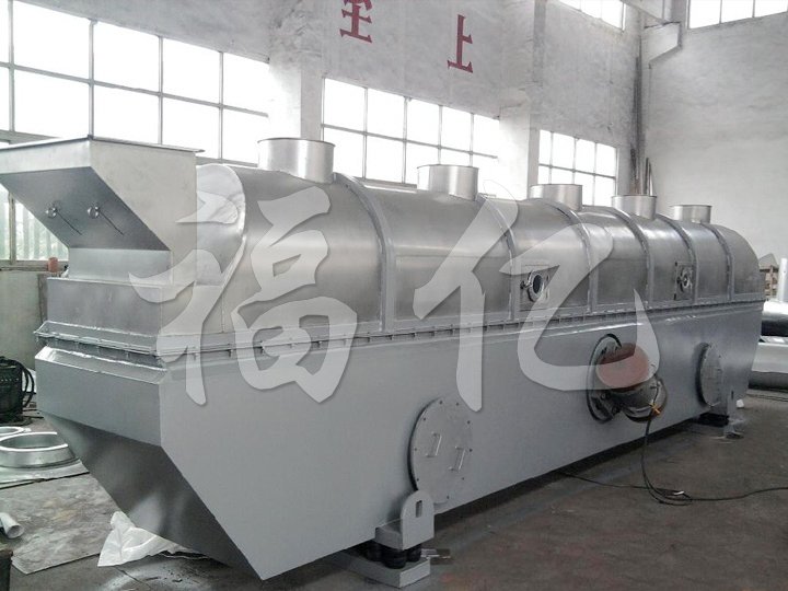 物料自進料進口進入機內(nèi),在振動力作用下,物料沿水平面流化床拋擲,向前連續(xù)運動,熱風(fēng)向上穿過流化床同濕物料換熱后,濕空氣經(jīng)旋風(fēng)分離器除塵后由排風(fēng)1:3排出.干燥物料由排料進口排出。